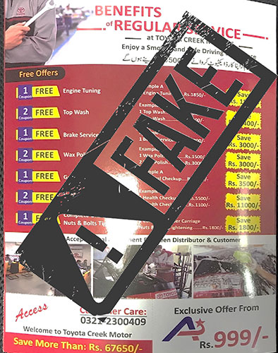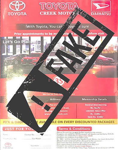 We have already lodged a complaint with local police and intend to peruse this matter legally. If you are approached by anyone selling a coupon book for Toyota Creek Motors, please do not purchase it. Inform the police immediately and notify us, by calling our UAN: 021-111-334-632.